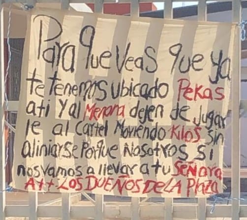 El escrito decía de manera textual: “Para que veas que ya te tenemos ubicado Pekas y a ti al Menona dejen de jugarle al cartel moviendo kilos sin alinearse porque nosotros si nos vamos a llevar a tu señora, att: LOS DUEÑOS DE LA PLAZA”.