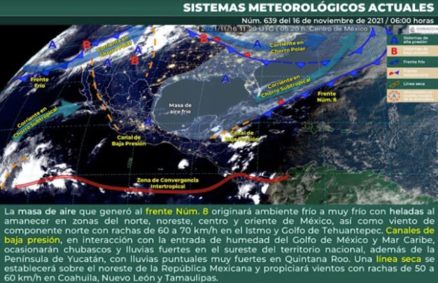 Así mismo, podría haber lloviznas en Isla Mujeres, Benito Juárez, Puerto Morelos, Cozumel, Solidaridad y Othón P. Blanco. Esto debido a canales de baja presión sobre el sureste del territorio nacional y en la Península de Yucatán, en interacción con la entrada de humedad del Golfo de México y Mar Caribe, que originarán chubascos y lluvias fuertes en ambas regiones, así como lluvias puntuales muy fuertes en Quintana Roo.
