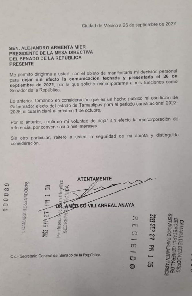 Mediante un oficio dirigido a Alejandro Armenta, presidente del Senado, Villarreal informa que “deja sin efecto” su solicitud de reincorporarse a su escaño.