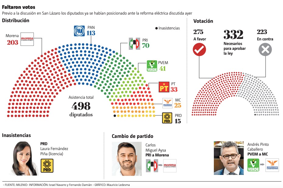 El pleno de la Cámara de Diputados desechó anoche la iniciativa de reforma eléctrica del Presidente, al no alcanzar la mayoría calificada de dos terceras partes de la votación. Con 275 votos del bloque Morena-PVEM-PT a favor y 223 del PAN, PRI, MC y PRD en contra, el proyecto se quedó a 57 de los 332 necesarios para ser avalado. En tanto, López Obrador envió anoche a la Cámara de Diputados su iniciativa de reformas a la Ley Minera para reservar la explotación del litio al Estado mexicano, sin permitir el otorgamiento de concesiones para ese efecto a empresas privadas.