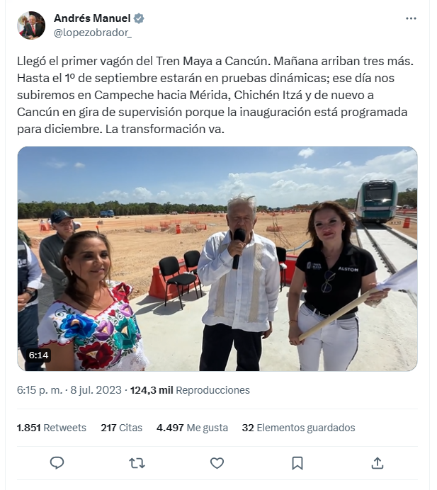 AMLO recibió el primer vagón del Tren Maya este sábado en Cancún