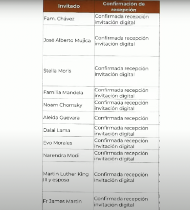 El presidente pidió a su equipo que enseñaran la lista de los invitados, la cual fue puesta en la pantalla detrás del mandatario federal, mostrando los números de vuelos y la hora y día de llegada de los invitados que ya confirmaron su asistencia, entre ellos el expresidente uruguayo José Mujica; Stella Moris, esposa de Julian Assange y la familia de Martin Luther king.
