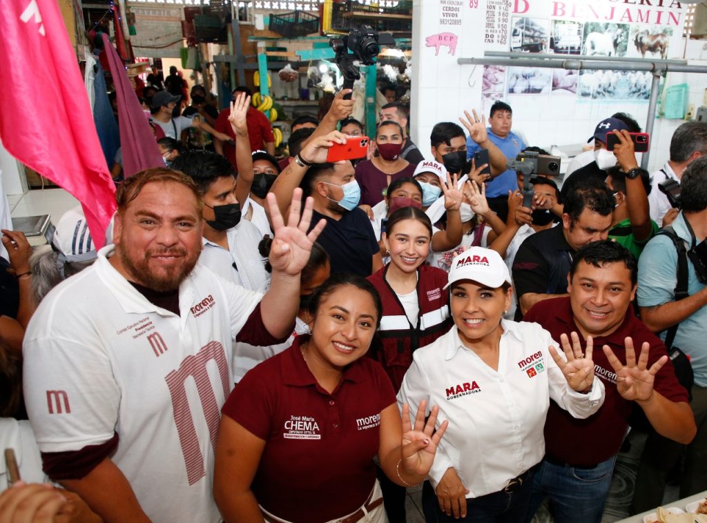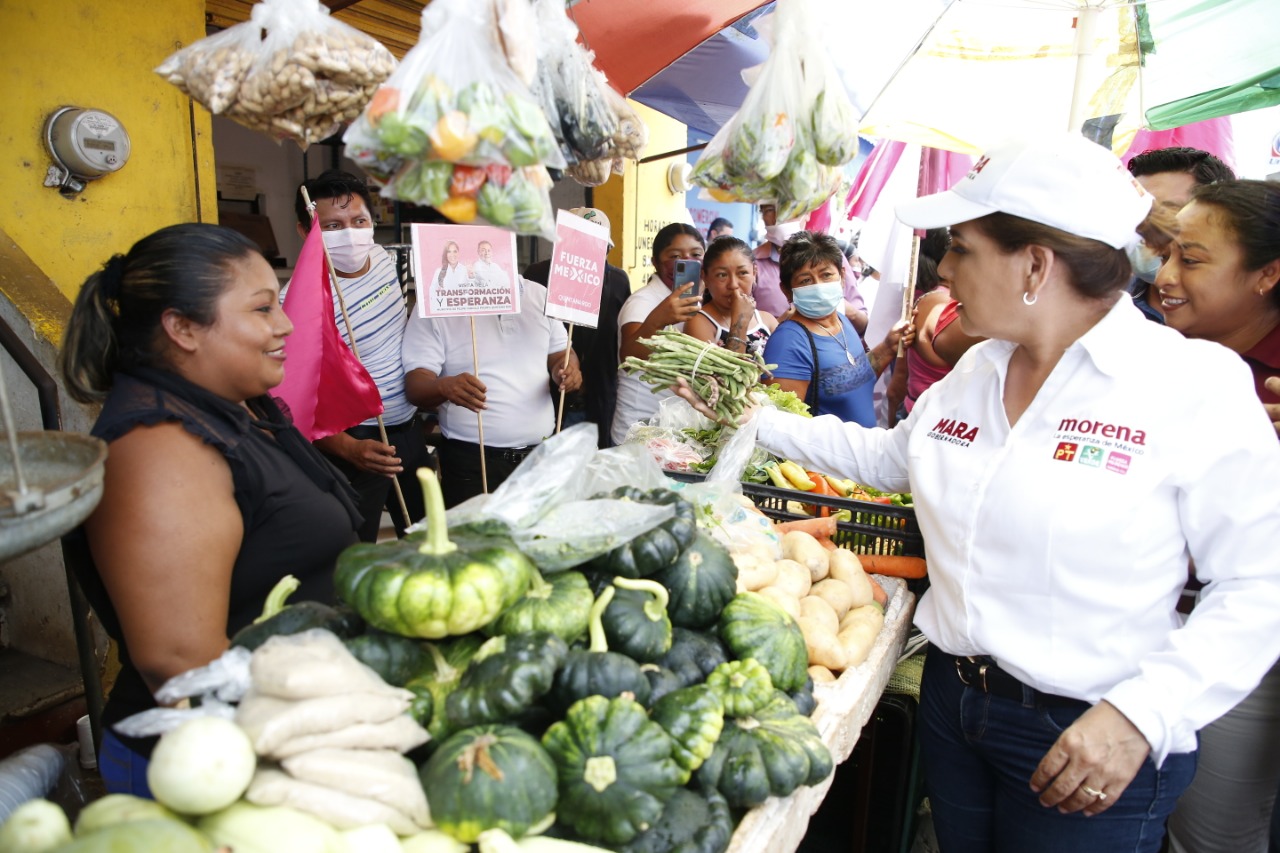 Familias enteras se arremolinaron en el Mercado Municipal para saludar a la candidata, quien en esta esta ocasión estuvo acompañada por José María “Chema” Chacón Chablé, candidato a diputado por el Distrito XII.