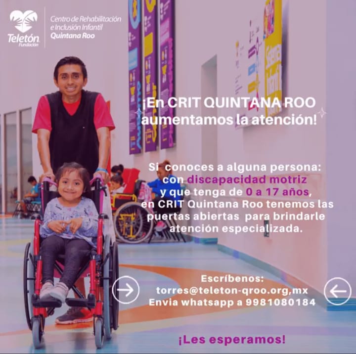 Cancún, Quintana Roo martes 07 de septiembre del 2021, poderycritica.- A partir del 6 de septiembre el CRIT Quintana Roo podrá atender a más personas de 0 a 17 años con discapacidad motriz.