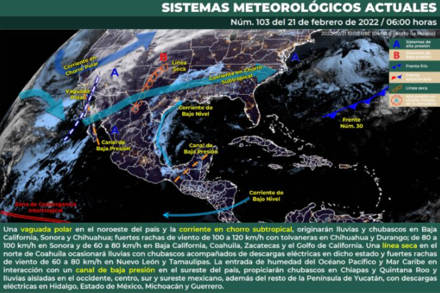 Para el resto del país la interacción de una vaguada polar, la corriente en chorro subtropical y una línea seca al norte de Coahuila, ocasionarán lluvias con chubascos y posibles descargas eléctricas en dichas regiones, con rachas de viento de 100 a 120 km/h con tolvaneras en Chihuahua, de 80 a 100 en Durango y de 70 a 90 km/h en Baja California, Sonora, Coahuila, Zacatecas, Nuevo León y Tamaulipas.