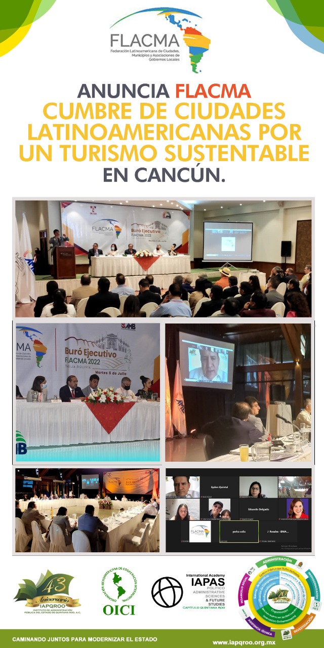 En esta segunda reunión presencial y virtual del Buró Ejecutivo de FLACMA, en la que de manera virtual, el Coordinador de FLACMA para Centroamérica y el Caribe y, Presidente del Consejo Directivo del Instituto de Administración Pública del Estado de Quintana Roo, A.C. (IAPQROO), León Ricardo Lizárraga Cubedo, tomó la palabra para hacer hincapié en la celebración de la Cumbre de Ciudades Latinoamericanas por un Turismo Sustentable a celebrarse en Cancún en febrero de 2023 y en la que participarán al menos las 50 ciudades más importantes del turismos mundial en Latinoamérica.