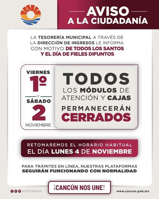 PODER Y CRÍTICA | REDACCIÓN | El Ayuntamiento de Benito Juárez, a través de la Tesorería Municipal y la dirección de Ingresos, anuncia el cierre de cajas y módulos para el viernes 01 y sábado 02 de noviembre, con motivo de los asuetos por el Día de todos los Santos y el Día de los Fieles Difuntos.