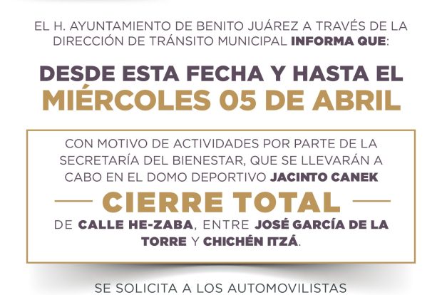 PODER Y CRÍTICA | REDACCIÓN | El gobierno municipal de Benito Juárez, a través de la Secretaría Municipal de Seguridad Pública y Tránsito, informa que, con motivo de actividades realizadas por parte de la Secretaría del Bienestar, en el domo deportivo Jacinto Canek, se llevará a cabo el cierre total de la calle He-Zaba, entre las avenidas José García de la Torre y Chichen Itzá.