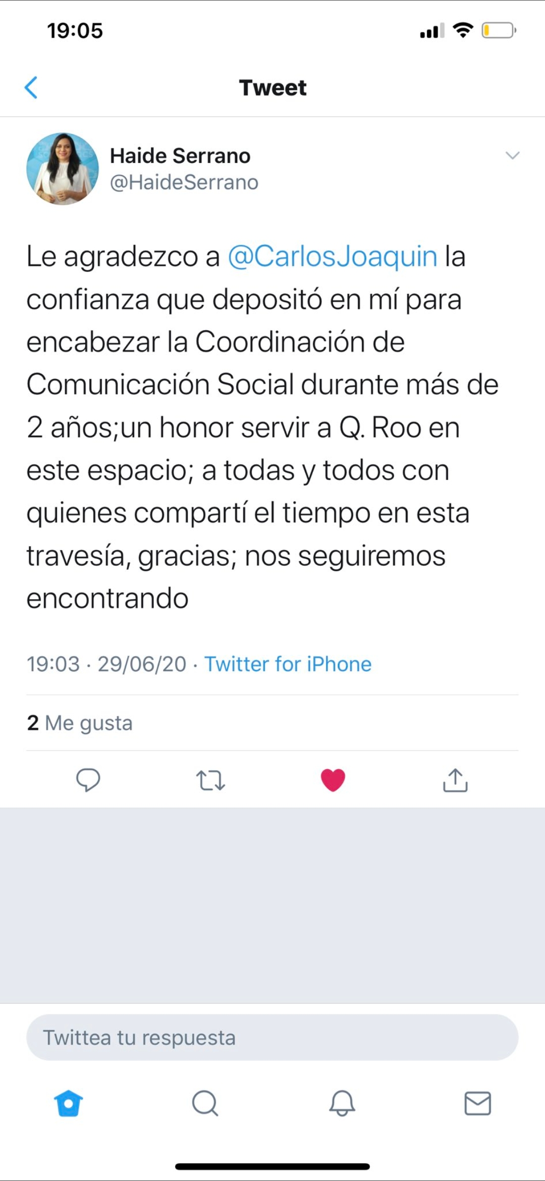 Por medio de su cuenta de Twitter, Haidé Serrano agradeció al gobernador Carlos Joaquín González por el apoyo y la confianza.