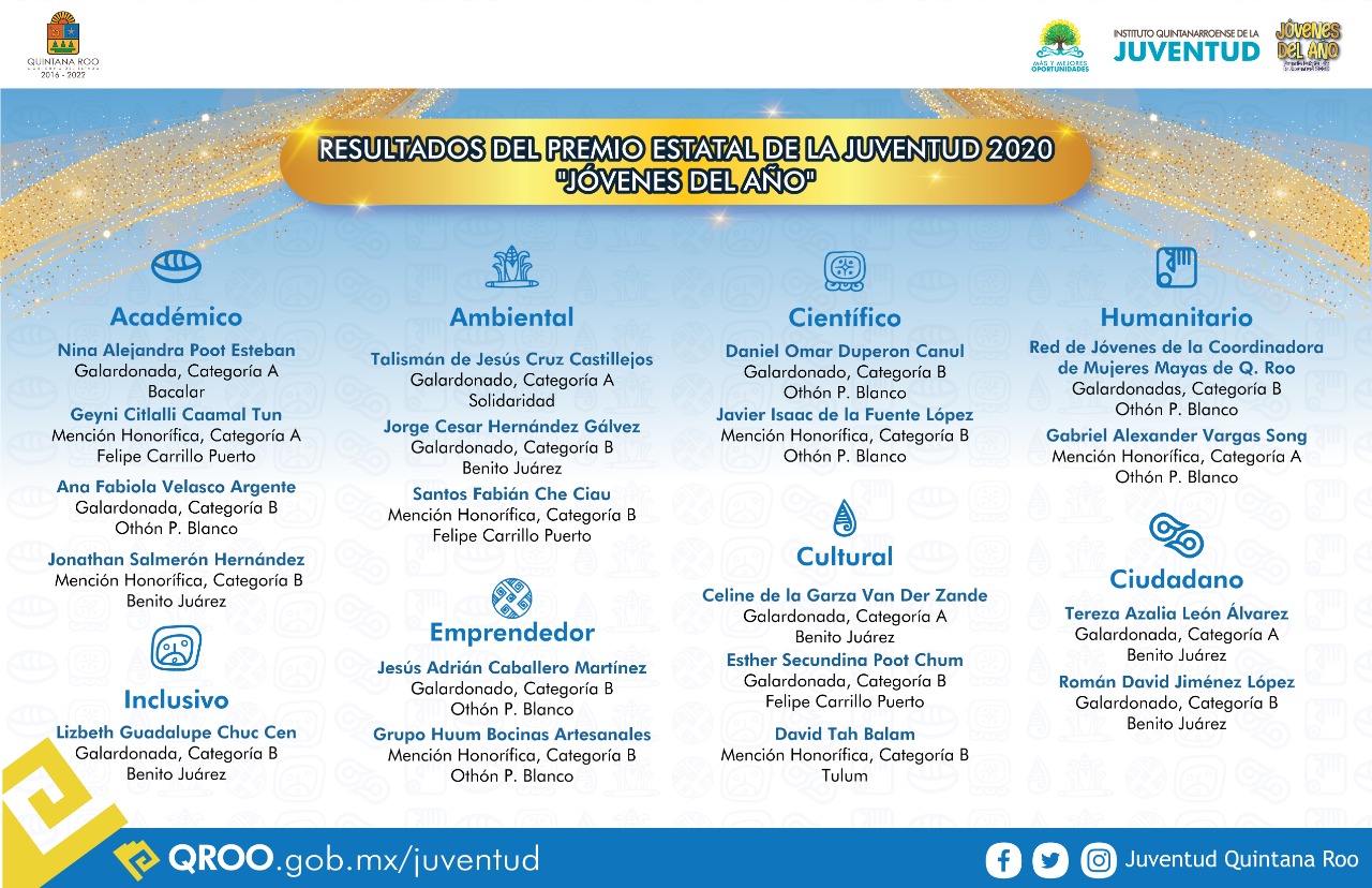 En el rubro científico ganó Daniel Omar Duperon Canul, mientras que la mención honorífica fue para Javier Issac de la Fuente López; en el rubro emprendedor resultó ganador Jesús Adrián Caballero Martínez y la mención honorífica la obtuvo el grupo Huum Bocinas Artesanales; en el rubro humanitario ganó la Red de Jóvenes de la Coordinadora de Mujeres Maya de Quintana Roo y la mención honorífica fue para Gabriel Alexander Vargas Song.