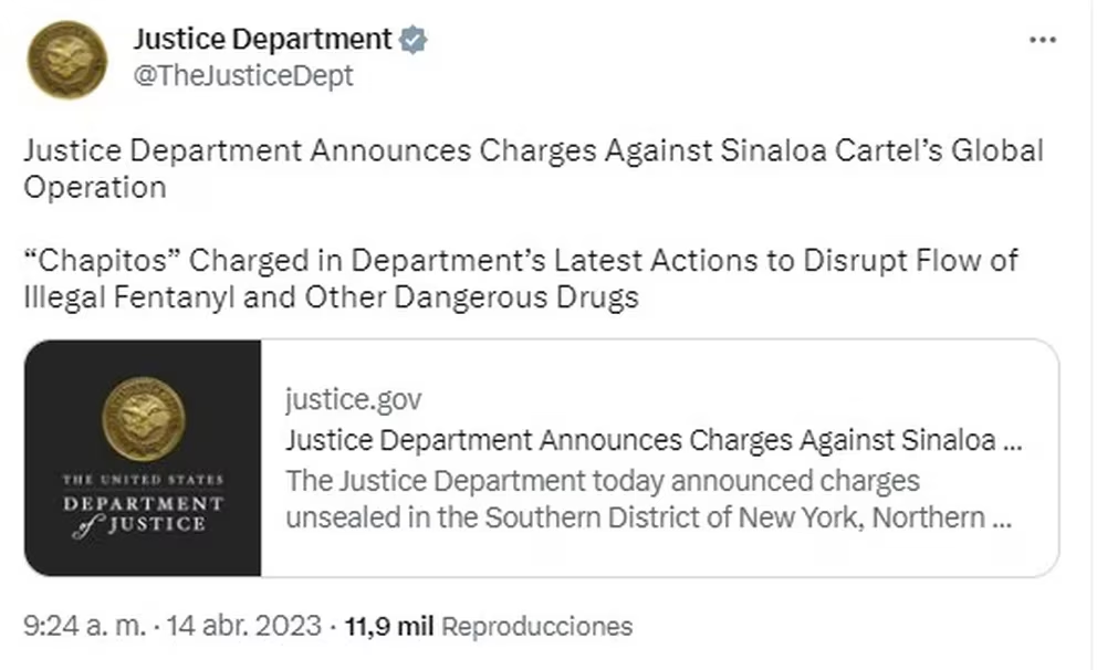 “Las acusaciones de hoy envían un mensaje claro a Chapitos, el Cártel de Sinaloa y las redes criminales de drogas en todo el mundo de que la DEA no se detendrá ante nada para proteger la seguridad nacional de los Estados Unidos y la seguridad y la salud del pueblo estadounidense”, expuso el Fiscal.