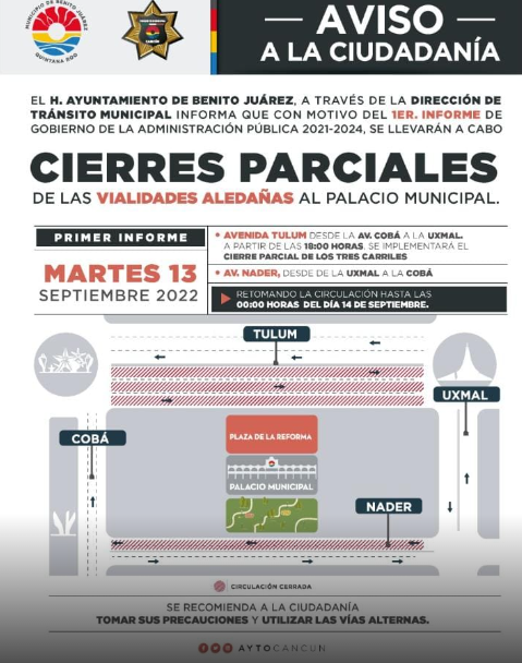 Poder y Crítica | Redacción | Este martes, algunas vialidades, cercanas al Palacio Municipal de Cancún, cerrarán de forma parcial, debido a la celebración del primer Informe de Gobierno de la presente administración del municipio de Benito Juárez.