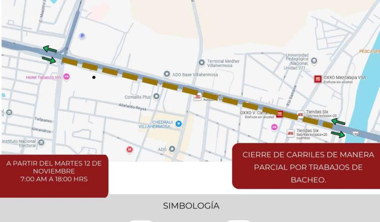Además, se realizará la repavimentación con concreto hidráulico en el crucero de las calles Niño Artillero y Melchor Ocampo, en la colonia Tamulté de las Barrancas, en el mismo horario. Estos trabajos también implicarán cierres parciales para proteger a automovilistas y peatones.