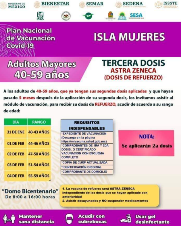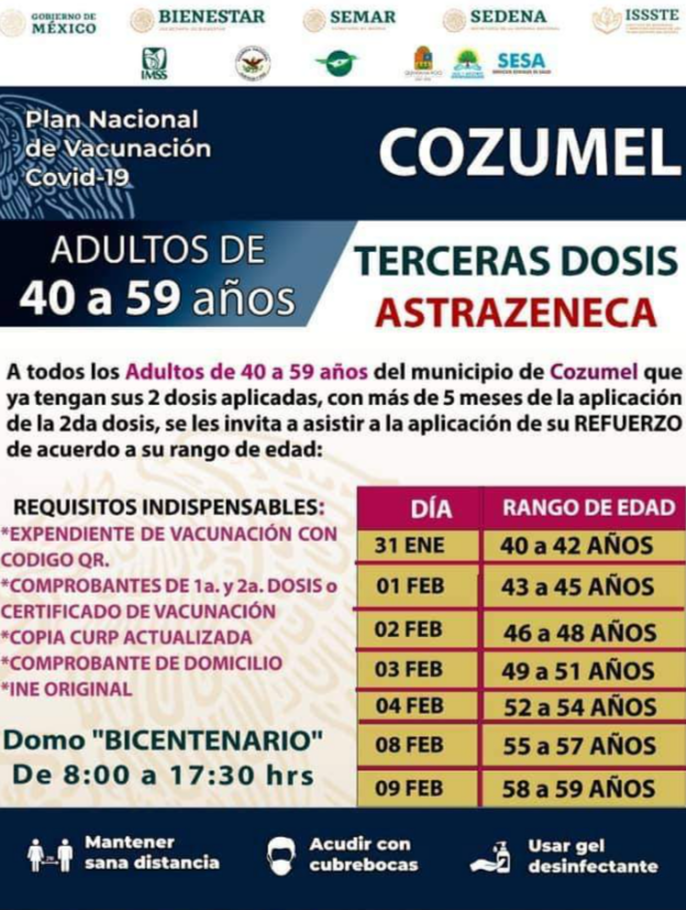 Una campaña similar iniciará simultáneamente en Isla Mujeres y Cozumel, con la única diferencia que estos municipios el rango de edad para acceder a la tercera dosis será de los 40 a los 59 años.