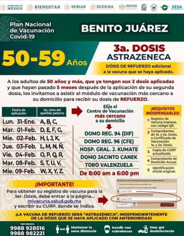 Una campaña similar iniciará simultáneamente en Isla Mujeres y Cozumel, con la única diferencia que estos municipios el rango de edad para acceder a la tercera dosis será de los 40 a los 59 años.
