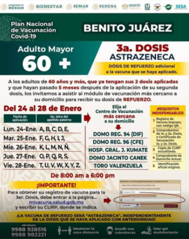 De acuerdo con la convocatoria, esta jornada de refuerzo es para los adultos mayores que ya cuenten con su esquema completo de dos dosis y que hayan pasado al menos cinco meses desde la última vacunación.