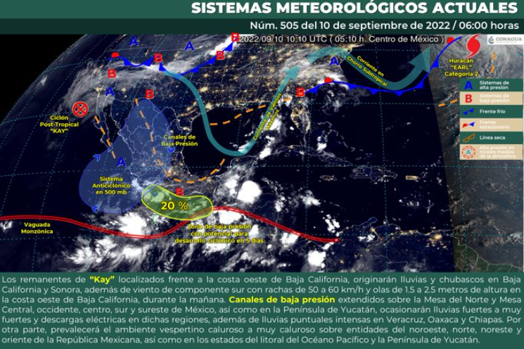 Lo anterior debido a Canales de baja presión extendidos sobre la Mesa del Norte y Mesa Central, occidente, centro, sur y sureste de México, así como en la Península de Yucatán que ocasionan lluvias fuertes a muy fuertes y descargas eléctricas en dichas regiones, además de lluvias puntuales intensas en Veracruz, Oaxaca y Chiapas.