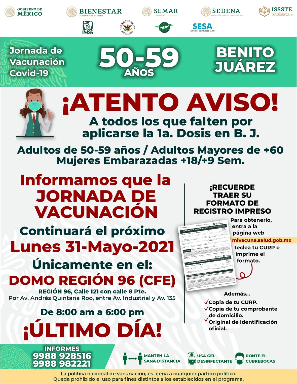Cancún, Q. Roo, Domingo 30 de Mayo de 2021, poderycrítica.- El H. Ayuntamiento de Benito Juárez da a conocer el seguimiento por parte de la Secretaría de Bienestar de la aplicación de primera dosis del biológico marca Pfizer para personas entre 50 a 59 años, la cual se llevará a cabo este lunes 31 de mayo, únicamente en el Domo de la Región 96, todo ello en cumplimiento de la segunda etapa del Plan Nacional de Vacunación a cargo del Gobierno de México.