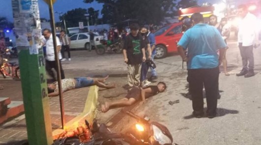 El percance se registró alrededor de las siete de la noche en plena avenida principal y dejó dos jóvenes que viajaban en la motocicleta con lesiones en diferentes partes del cuerpo y que quedaron tirados sobre la calle, en espera de la llegada de una ambulancia con personal del hospital integral para que los valoraran.