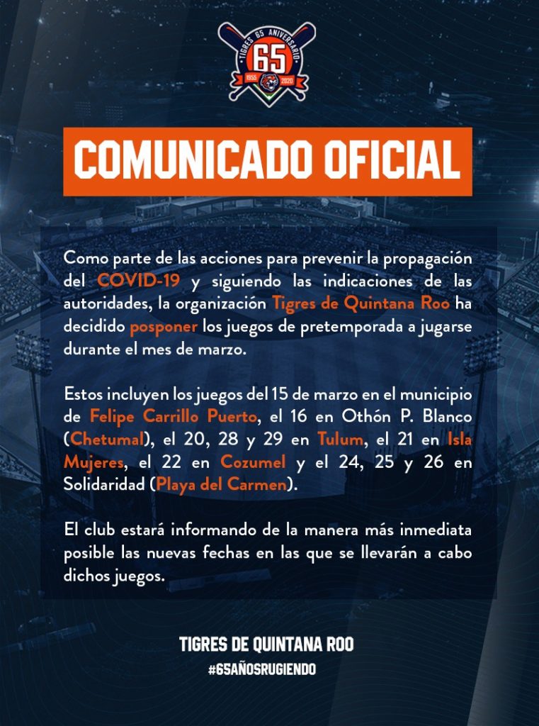 Ciudad de México, 14 de marzo.- La Liga Mexicana de Beisbol (LMB) informa que la pretemporada de todos los equipos que integran nuestro circuito queda oficialmente suspendida y el inicio de la temporada 2020 se aplaza para el lunes 11 de mayo del 2020; en tanto no haya un nuevo aviso, de conformidad con las autoridades sanitarias del Gobierno Federal.