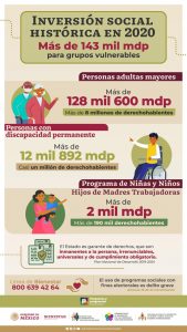 Ciudad de México, Miércoles 30 de Diciembre del 2020, poder crítica.- En apego al principio impulsado por el presidente Andrés Manuel López Obrador de que por el bien de todos primero los más pobres, este 2020 la Secretaría de Bienestar aplicó una inversión social histórica al destinar más de 143 mil millones de pesos para personas adultas mayores, personas con discapacidad, así como niñas y niños hijos de madres trabajadoras.