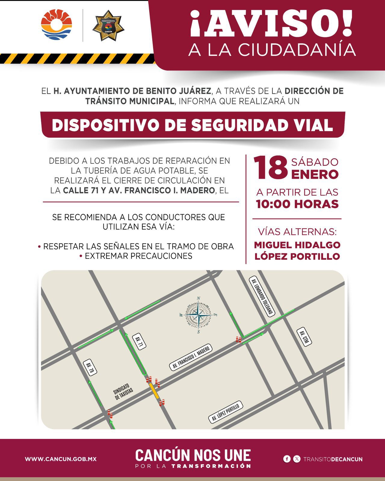 PODER Y CRÍTICA | REDACCIÓN | El Ayuntamiento de Benito Juárez, a través de la Dirección de Tránsito Municipal, informó que debido a la reparación de una tubería de agua potable sobre la avenida Francisco I. Madero, se llevará a cabo un dispositivo de seguridad vial.
