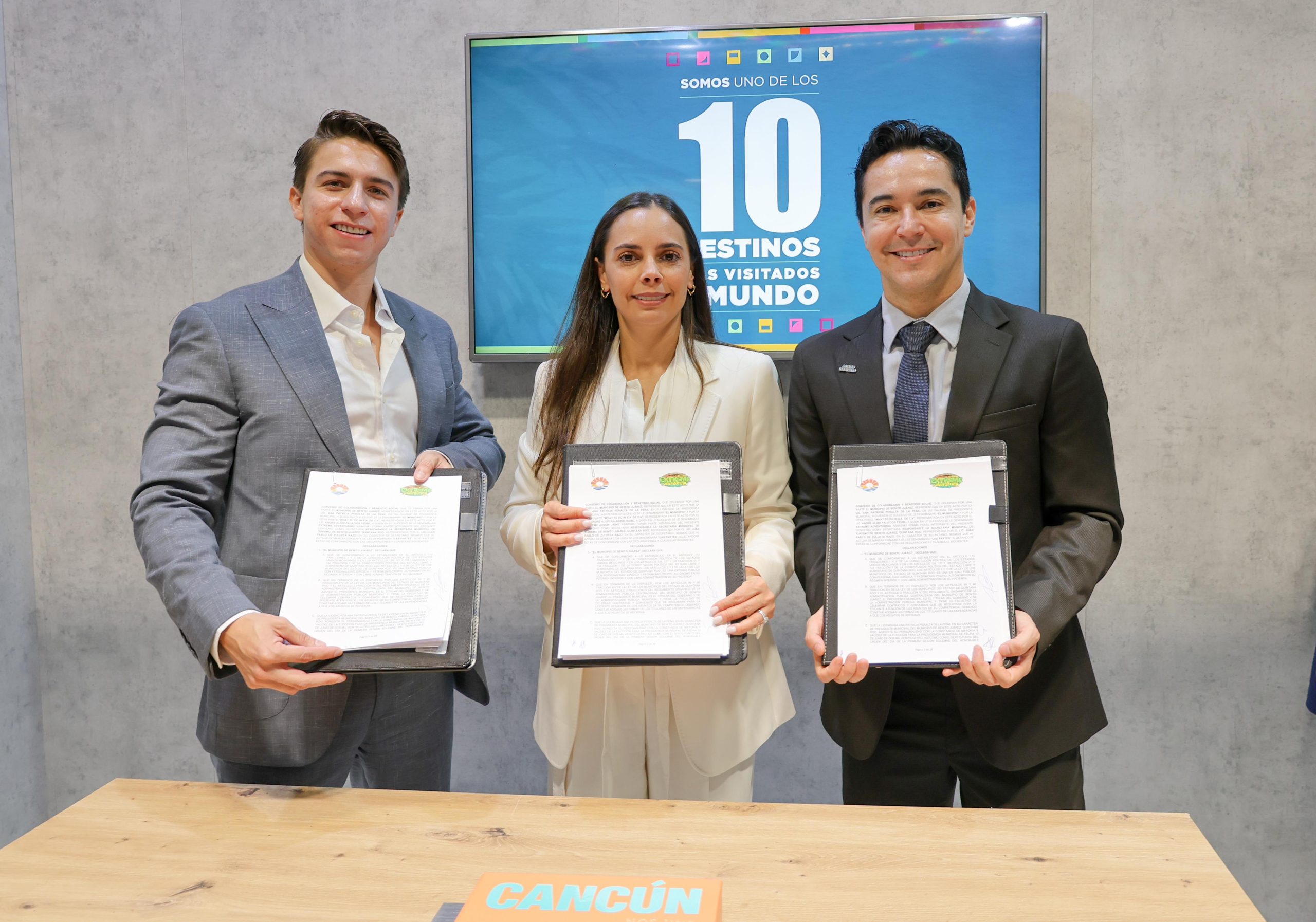 En el stand de Cancún en el IFEMA Madrid, sede de la importante feria internacional del ramo, junto con el secretario municipal de Turismo, Juan Pablo de Zulueta Razo, la Primera Autoridad Municipal signó primeramente un documento y sostuvo una reunión de trabajo con los fundadores de Grupo Xcape: Rodrigo Velez, Israel Escalante y José Ignacio Ruelas Chiquini, empresa cancunense, la cual destacó se ha consolidado como un referente a nivel mundial para gente joven, con presencia en todo México y una expansión sostenida en nueve países, que tan solo en el 2024, movilizó a 15 mil estudiantes hacia el destino líder del Caribe Mexicano.
