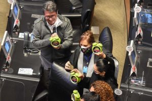 Cuando se aprobó en lo general la iniciativa, los senadores festejaron con una ronda de aplausos y con el ruido de las alarmas de unos relojes de color verde, proporcionados por el partido Movimiento Ciudadano (MC) y cuya leyenda rezaba: “Es la hora de legislar”.