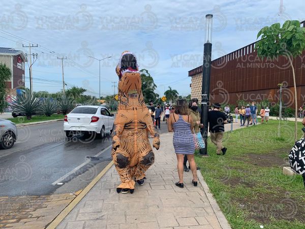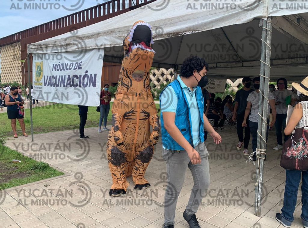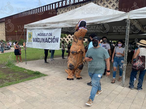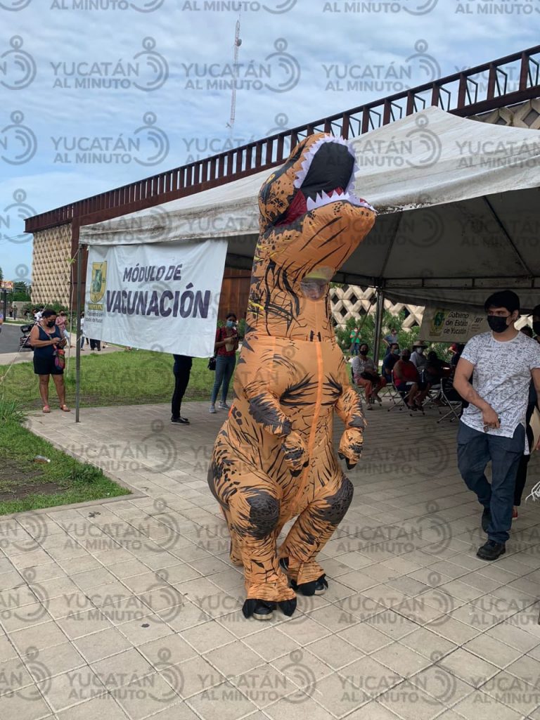 Mérida, Yucatán, jueves 09 de septiembre de 2021, poderycrítica.- Joven acude disfrazado de dinosaurio T-rex a vacunarse contra el covid-19 y se robó las miradas de todos los que hacían fila.
