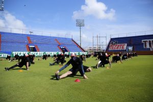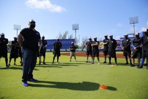 Erick Herrera se encargó de poner a punto al nutrido grupo, para seguidamente separar a los jugadores de cuadro, de los lanzadores. Estos últimos tuvieron otra charla previa al trabajo con el coach de picheo Mercedes Esquer, quien dividió el grupo en cuatro para hacer trabajo físico, bullpen, estiramiento y simulación de jugadas dentro del cuadro.