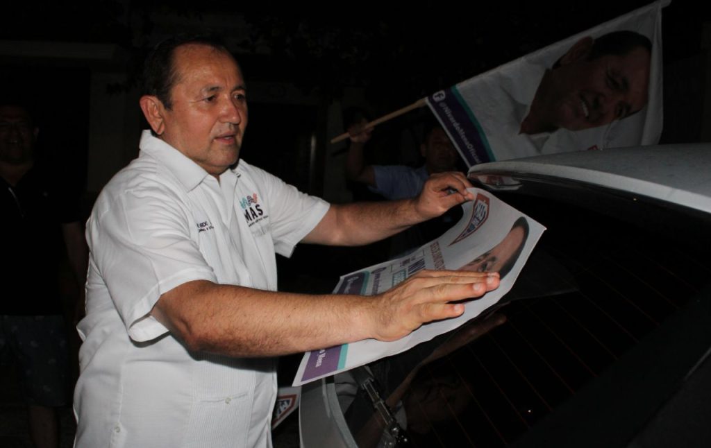 Acompañado de seguidores, el candidato del MAS al gobierno del Estado, Nivardo Mena, realizó la colocación de microperforado en auto de algunos simpatizantes de Cozumel, así como invitar a la población en general para que asistan al arranque de compaña de manera oficial hoy a las 4:00 de la tarde en el Centro de Espectáculos Moby Dick.