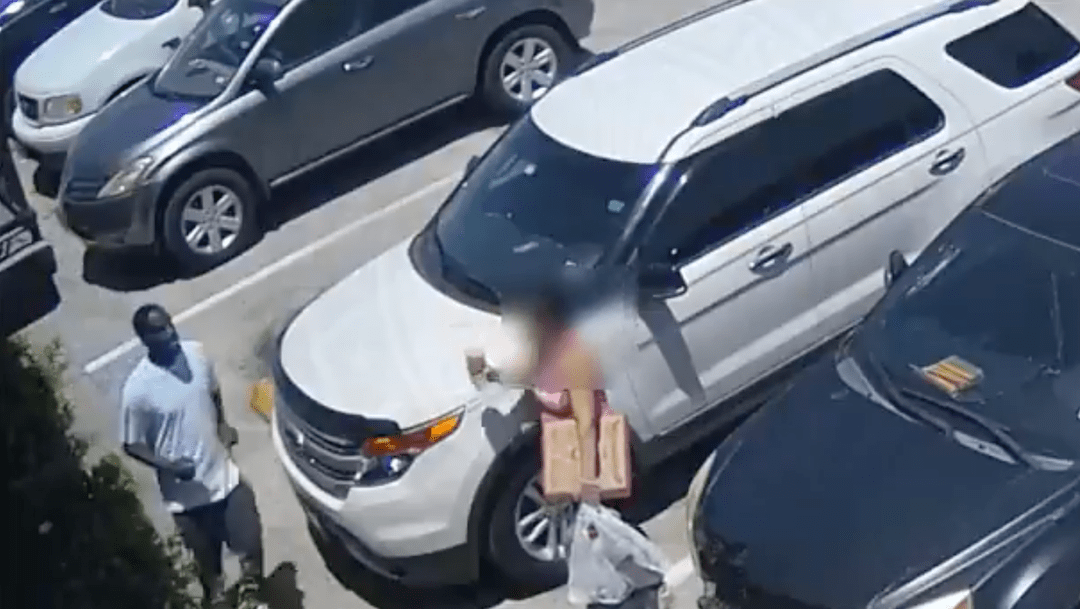 Una cámara de seguridad captó el momento en que un automóvil blanco marca Nissan se acerca a un estacionamiento perteneciente a un edificio de departamentos ubicado en la cuadra 7000 de la calle Renwick. Simultáneamente, una mujer y su hijo están bajando bolsas y una caja de pizza de una camioneta color blanco.
