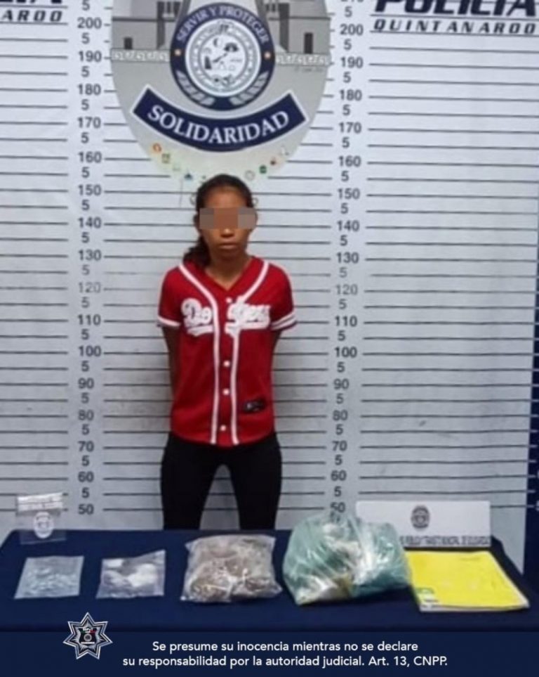 PODER Y CRÍTICA | REDACCIÓN | Cuando implementaban labores de vigilancia y disuasión de delitos, policías de la Secretaría de Seguridad Pública y Tránsito Municipal de Solidaridad aseguraron a una mujer en posesión de diversos posibles narcóticos.