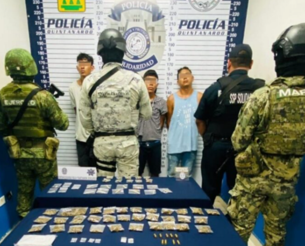 Poder y Crítica | Redacción | Tres presuntos narcomenudistas (uno de ellos menor edad) fueron capturados ayer en posesión de 64 envoltorios con dosis de droga y 9 cartuchos útiles en el fraccionamiento Villas del Sol de esta ciudad.