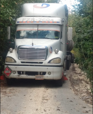 Chetumal, Quintana Roo: Agentes adscritos al Grupo Operativo de la Coordinación de la Policía Federal que realizaban labores de vigilancia a la altura del kilómetro 070+300 de la carretera Lázaro Cárdenas – Polyuc observaron un tractocamión color blanco doblemente articulado tipo auto tanque, con rombos de identificación de material peligroso nomenclatura 1202 (hidrocarburo diésel) desvió su ruta ingresando a un predio el cual se tiene el antecedente de venta clandestina de hidrocarburos (gasolina y diésel).