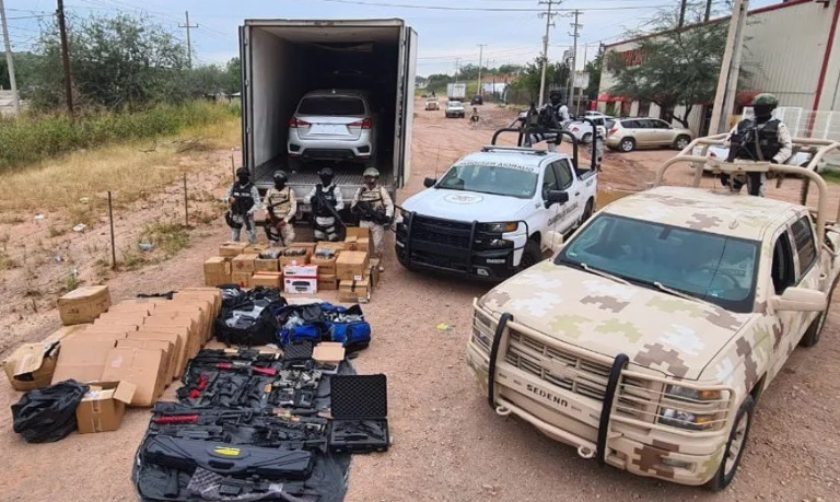 PODER Y CRÍTICA | REDACCIÓN | Un tractocamión fue asegurado la tarde del 8 de septiembre en Nogales, luego que se dictaminara que en su interior podría haber material ilícito, por lo que al inspeccionarlo se descubrió que había cajas con armas de fuego de grueso calibre, cartuchos, cargadores y otros vehículos, por lo que se procedió a su decomiso.