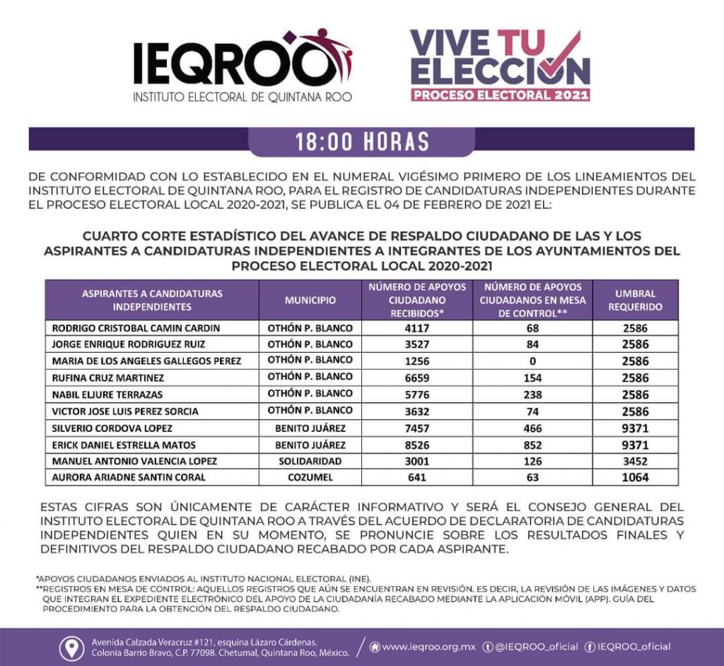 De acuerdo a las últimas cifras emitidas por el INE, Silverio ya había reunido siete mil 457 apoyos ciudadanos de los nueve mil 371 que requiere para poder aspirar, sin embargo la autoridad en Quintana Roo deberá aclarar cuál es la situación de Córdova López al promover el voto y otorgar apoyos a cambio de “firmas”.