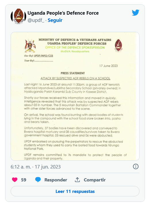 El portavoz de la policía ugandesa, Fred Enanga, explicó que la milicia ADF, que tiene su bastión en el este de la RDC, atacó una escuela de secundaria cerca de Bwera, donde “prendió fuego a un dormitorio y saqueó una tienda de comida”.