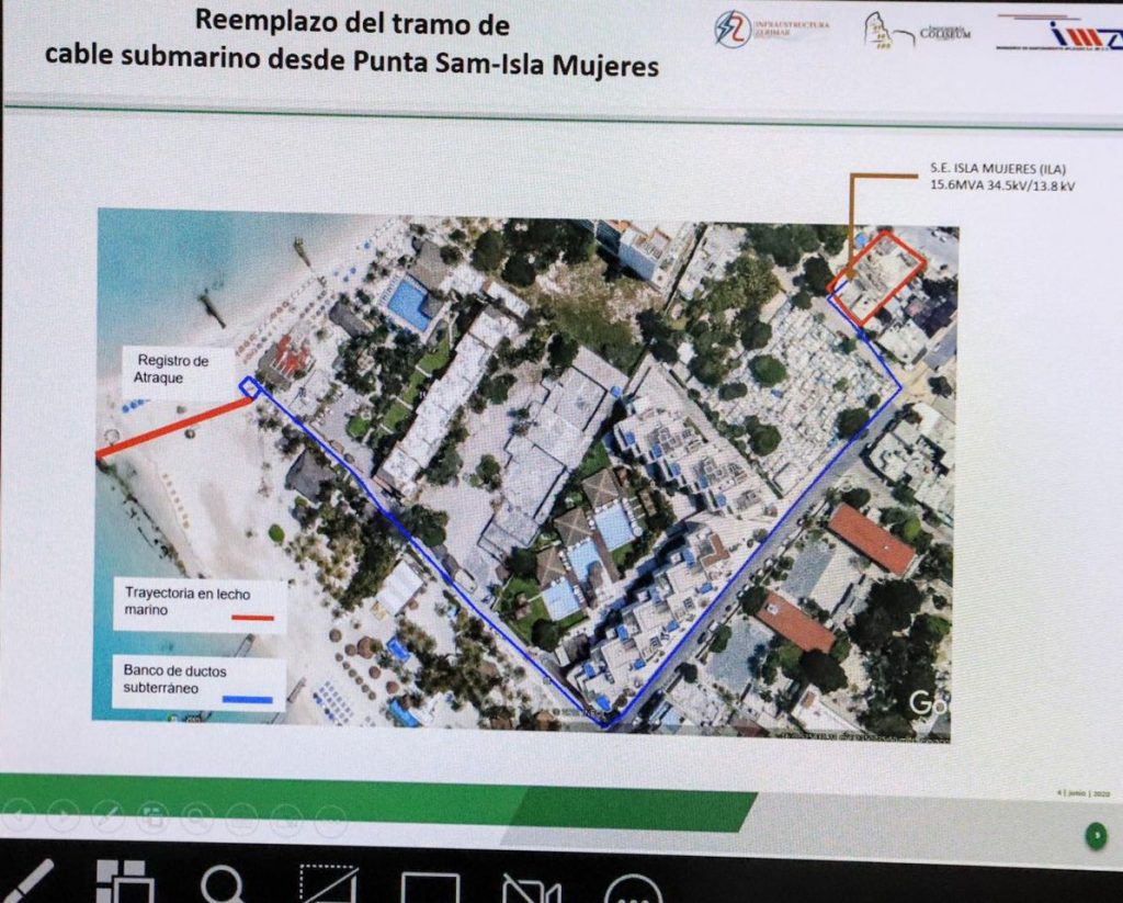 La sustitución del cable va desde Punta Sam hasta Isla Mujeres, trayecto en el que se colocarán cuatro cables monopolares submarinos en media tensión con 48 fibras ópticas y 6.9 kilómetros de longitud. Se estima que la obra concluya a finales de diciembre.