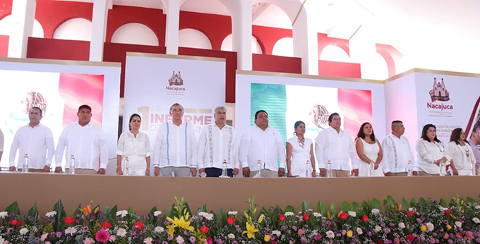 Tabasco, 12 diciembre; poderycritica.-El gobernador Adán Augusto López Hernández, asistió este miércoles al Primer Informe de Gobierno de la presidenta municipal de Nacajuca, Janicie Contreras García, a quien reconoció su esfuerzo por llevar el bienestar a toda la población.