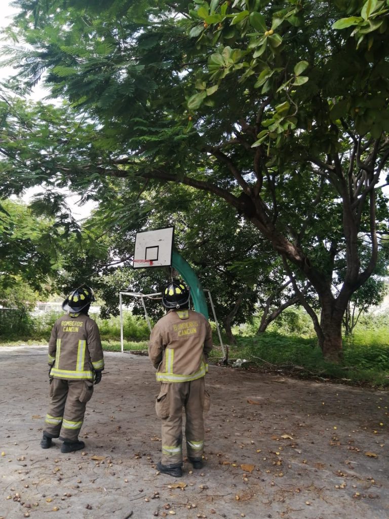 PODER Y CRÍTICA | REDACCIÓN | Elementos del Heroico Cuerpo de Bomberos del Ayuntamiento de Benito Juárez, acudieron al llamado de un reporte recibido mediante el número de emergencia 911, por ataque de abejas en la Escuela Primaria Guadalupe Victoria, ubicada en la Supermanzana 72.