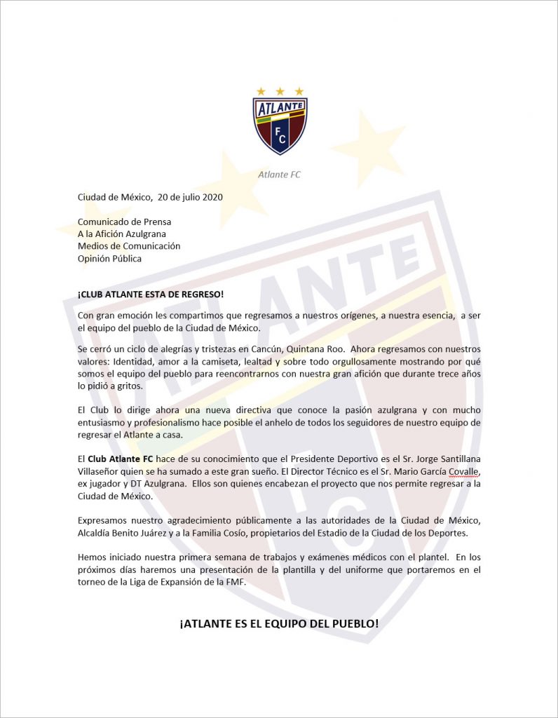 A través de un comunicado, el club atlantista dio su agradecimiento a las autoridades de la Ciudad de México y a la alcaldía de Benito Juárez por las facilidades otorgadas para poder jugar en el estadio de la Ciudad de los Deportes.