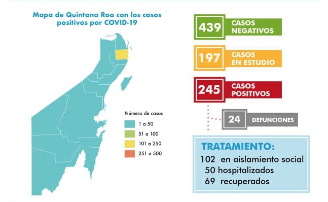 Chetumal, Q. Roo, Martes 14 de Abril de 2020, poderycrítica.- Al registrar todos los municipios de Quintana Roo por lo menos un caso positivo de coronavirus, la cifra a las 12 del día de este martes 14 de abril aumentó a 24 muertos y 245 infectados.