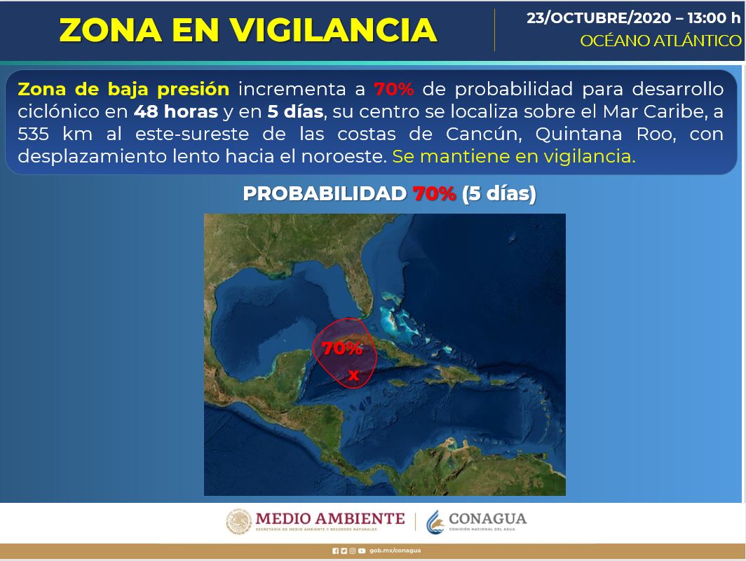 Chetumal, Q. Roo, Viernes 23 de Octubre de 2020, poderycrítica.- La zona de baja presión en el mar Caribe aumentó a 70 por ciento de probabilidad para desarrollo ciclónico en 48 horas.
