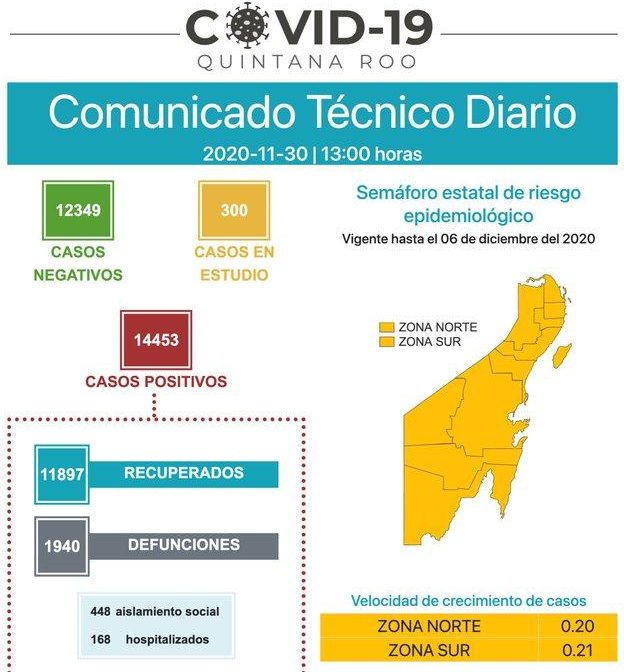 De acuerdo al comunicado técnico de la Secretaría de Salud de los 14,453 casos confirmados, 1940 corresponden a defunciones y 11,897 a personas recuperadas, además otras 300 personas se encuentran bajo estudio.