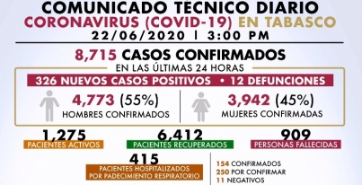 Con corte de las 15:00 horas, el informe detalla que gracias al esfuerzo del personal médico se han recuperado seis mil 412 tabasqueños; mientras que 415 más permanecen hospitalizados por padecimientos respiratorios, de los cuales, 154 han dado positivo a SARS-Cov-2, otros 250 esperan resultados de laboratorio y 11 dieron negativo.