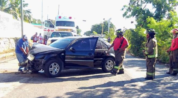 Un automóvil Volkswagen Jetta negro avanzaba por la avenida 20 de Noviembre, con dirección a la Kabah, en la Región 222 de la ciudad, cuando se estrelló contra esta ambulancia que estaba estacionada junto a la banqueta, ya que los paramédicos buscaban una dirección.