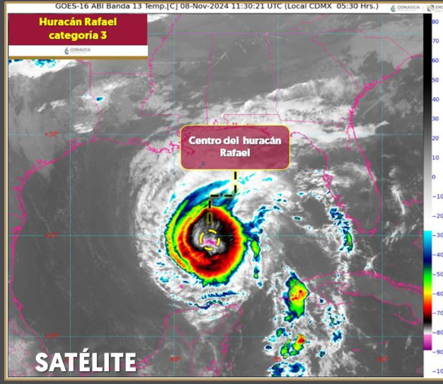 De acuerdo al último reporte, el huracán Rafael, categoría tres, se localiza a 320 km al norte de Río Lagartos, Yucatán y a 380 km al nor-noreste de Progreso. Presenta vientos máximos sostenidos de 195 km/h, rachas de 240 km/h y desplazamiento hacia el oeste a 15 km/h.