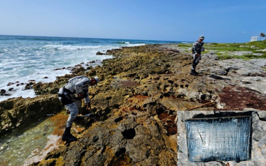 El hallazgo se registró cuando los guardias nacionales realizaban un recorrido de inspección en el lugar, cuando se percataron de que, entre las rocas y el sargazo de la playa había un paquete rectangular, emplayado con cinta transparente.