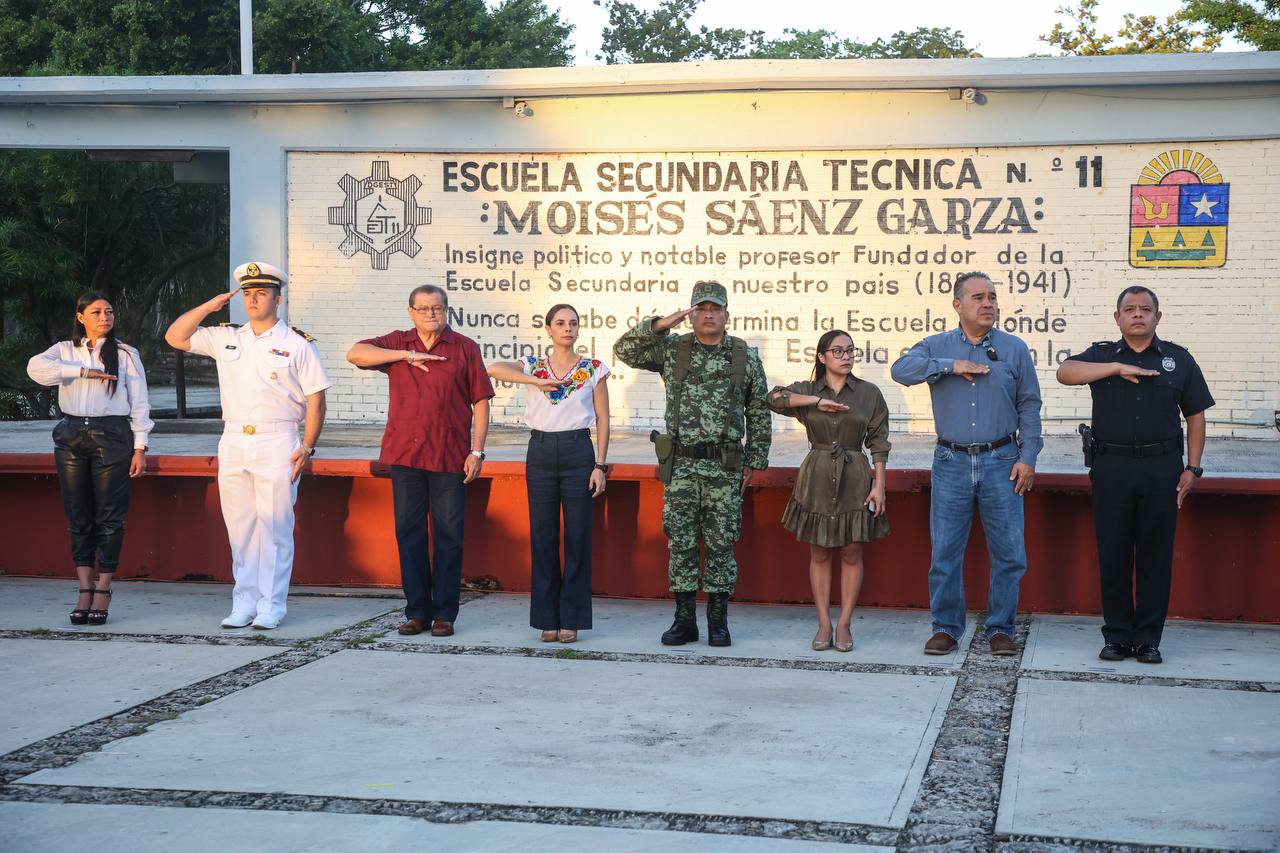 En este acto protocolario, la Primera edil estuvo acompañada de Elizardo Sánchez Espejo en representación del subsecretario social e interinstitucional del gobierno del Estado Zona Norte, Francisco Carrillo Flores; el director de la escuela secundaria técnica número 11, “Moisés Sáenz Garza”, Alonso Fernández González; el supervisor de la zona escolar, Gualberto Salazar Rosado, así como autoridades militares, navales, educativas y funcionarios municipales.